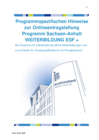 1 Programmspezifischen Hinweise zur Onlineantragstellung Programm Sachsen-Anhalt WEITERBILDUNG ESF + Der Zuschuss für individuelle berufliche Weiterbildungen und zum Erwerb von Zusatzqualifikationen…