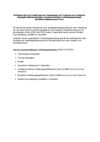 Richtlinien über die Gewährung von Zuwendungen zur Förderung von erfolgreich abgelegten Meisterprüfungen und gleichwertigen Fortbildungsprüfungen (Richtlinien Meisterbonus PLUS) Mit dem Bonus werden…
