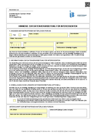 Einzureichen an: Investitionsbank Sachsen-Anhalt Domplatz 12 39104 Magdeburg HINWEISE ZUR DATENVERARBEITUNG FÜR INTERESSENTEN 1. ANGABEN DER BETROFFENEN NATÜRLICHEN PERSON Frau Herr Geburtsdatum …