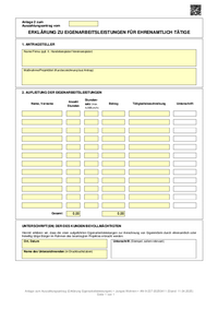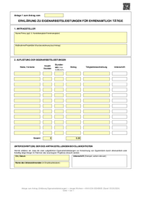 Anlage 2 zum Auszahlungsantrag vom ERKLÄRUNG ZU EIGENARBEITSLEISTUNGEN FÜR EHRENAMTLICH TÄTIGE 1. ANTRAGSTELLER Name/Firma (ggf. lt. Handelsregister/Vereinsregister) Maßnahme/Projekttitel…